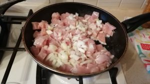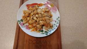 - Vyprážané kurča s cibuľou v rastlinnom oleji.