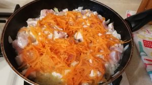 - Mriežka na strúhadle. Pridajte mrkvu a kuracie mäso.