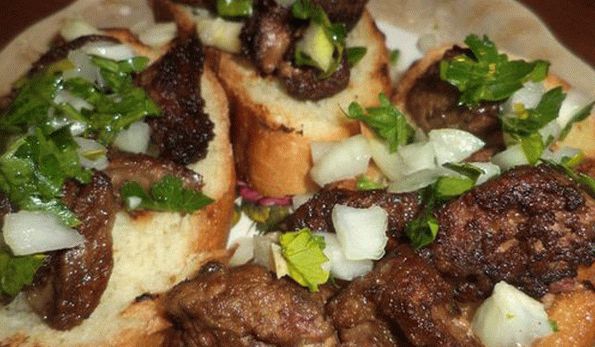 - Smažte pečeň v oleji. Nakrájajte na dve alebo tri časti, zmiešajte s nakladaná cibuľa.