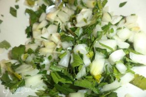 - Cibuľa, petržlen, šupka, kotleta, naliať olej, ocot, miešajte, čistite 20 minút v chladničke.