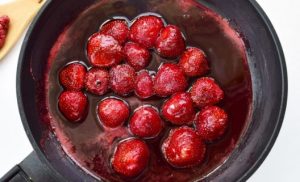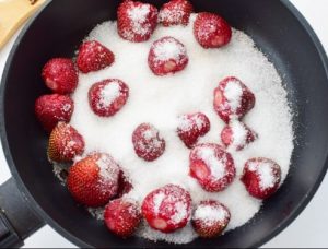 - Panvicu zohrejeme, pridáme cukor a jahody. Varte do rozpustenie cukru pri strednom ohni.