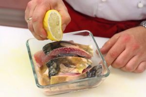 Čistý filet z kapra by mal byť nakrájaný na porcie. Vezmite citrónovú šťavu, dva druhy horčice a medu. Všetko veľmi opatrne premieša sa a odloží sa na 20 minút.