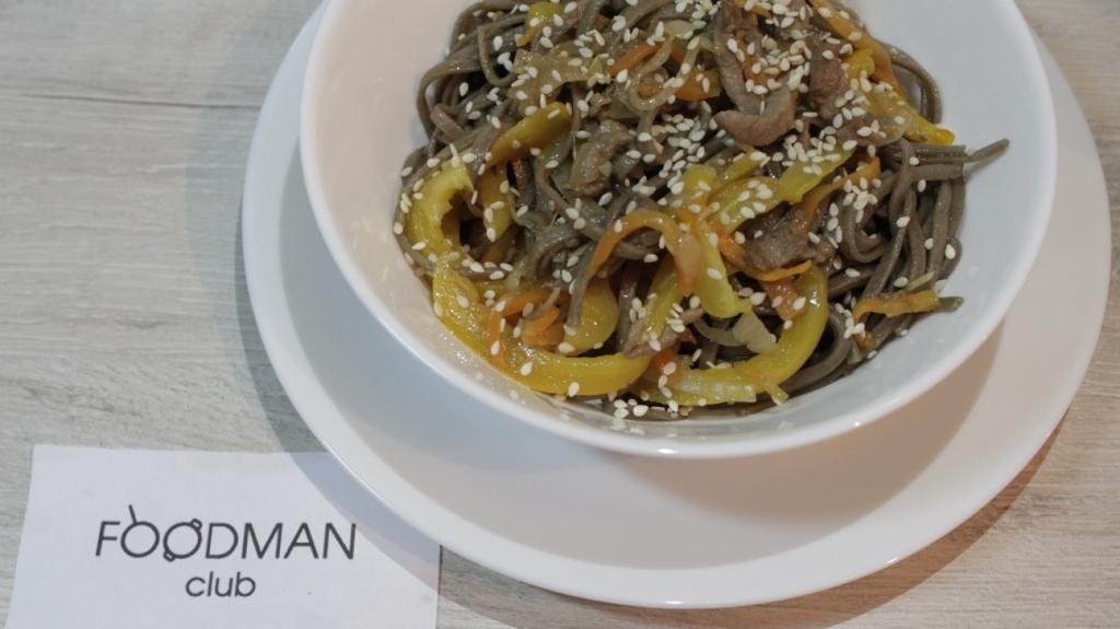 - Vložte rezance z pohánky do panvice a opečte zelenina a mäso 2 minúty.