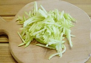 - Nastrúhajte jablká alebo nakrájajte na prúžky.