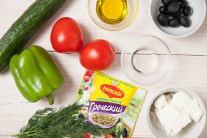 - Čistíme korenie z priečok, chvosta a semien. Papriky, uhorky a nakrájajte paradajky na plátky. Jemne nasekajte greeny.