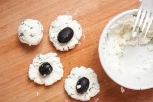 - Formujeme malé koláče z feta, do stredu koláčov naneste na olivovník a vytvorte guľu.