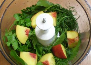 - Zo zelene odstraňujeme hrubé časti. V nektárine odstráňte kost a nakrájajte mäso na kúsky.