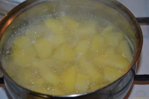 - Zemiaky nakrájajte na plátky a vložte do vody. zemiaky až do úplného uvarenia asi 20 minút.