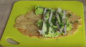 - Zemiakový koláč sme položili na pracovnú plochu na jednu stranu dáme šalát, sleď, uhorku a posypeme зеленым луком и