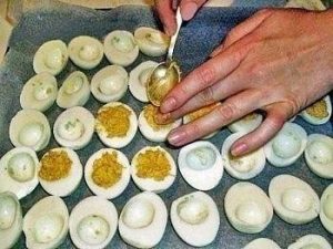 - Žĺtok zmiešaný s vidličkou so strúhaným syrom, pridajte strúhaná varená mrkva, rozdrvený cesnak, trochu kyslej smotany a soľ podľa chuti. Všetko dôkladne premiešajte. Výsledná zmes začíname polovice proteínov a kombinujeme ich. Plníme sa vajcia.